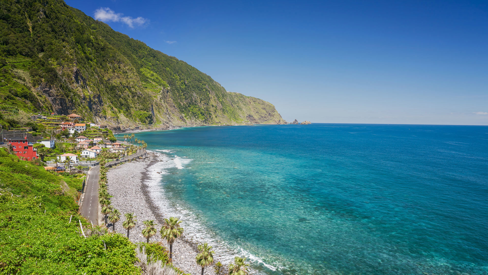 Praia de areal negro, envolvida pelo verde das montanhas imponentes.